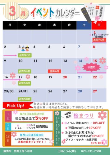 今月は季節限定のお豆腐、桜とうふ・花麩入りひろうすを販売致します。